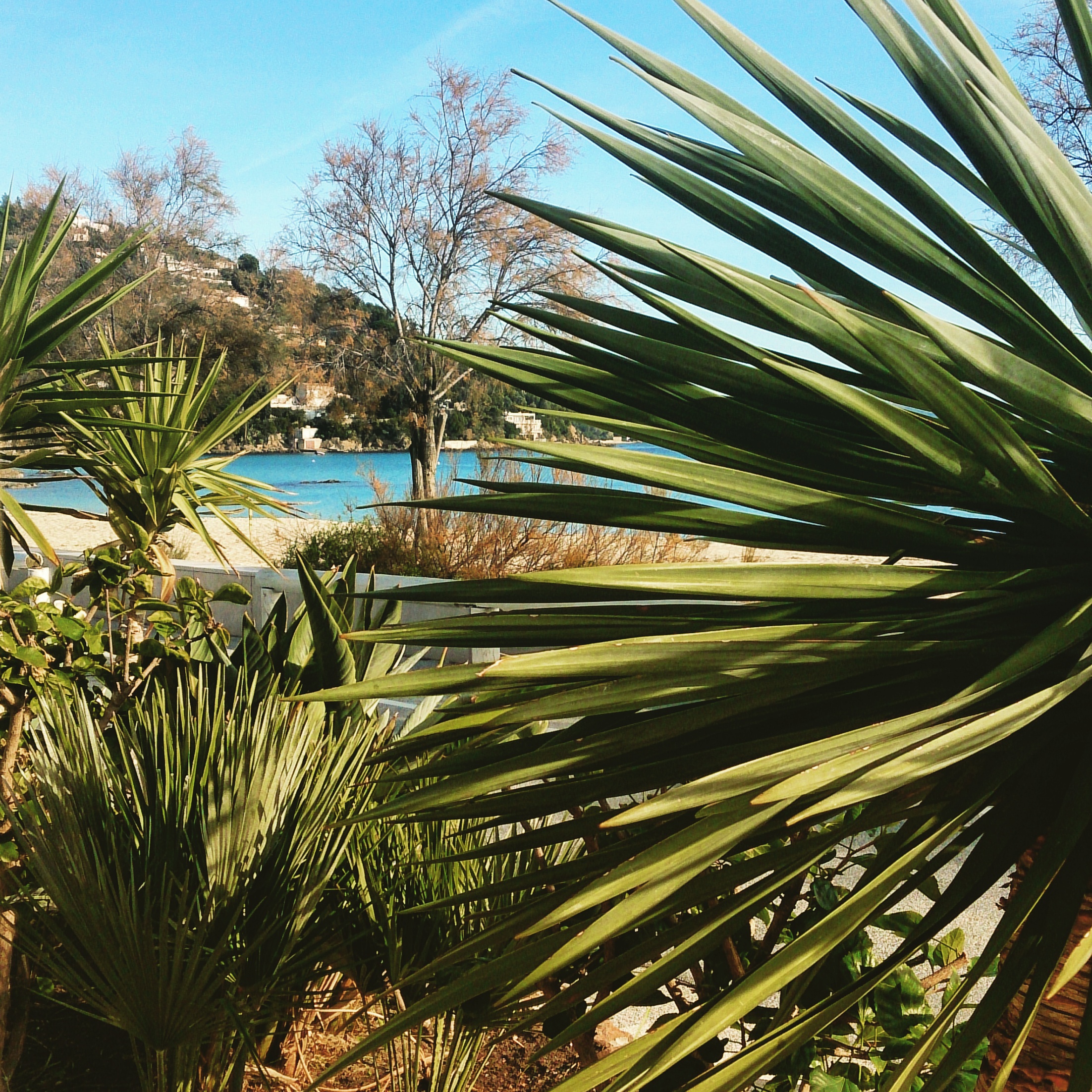 Hier sind wir an der Strandpromenade in "St. Clair", einem Vorort von Le Lavandou und schauen durch die Palmen auf den feinkrnigen Sand und das flach daliegende Meer. Es ist Nebensaison, nur ein Caf hat geffnet. Die Terrasse schtzt uns vor dem kalten Wind, wir knnen unsere Pullis ausziehen und einen Moment der Wrme und Stille bei einem "petit caf" genieen. Die Zeit darf gerne einen Moment stehen bleiben!
